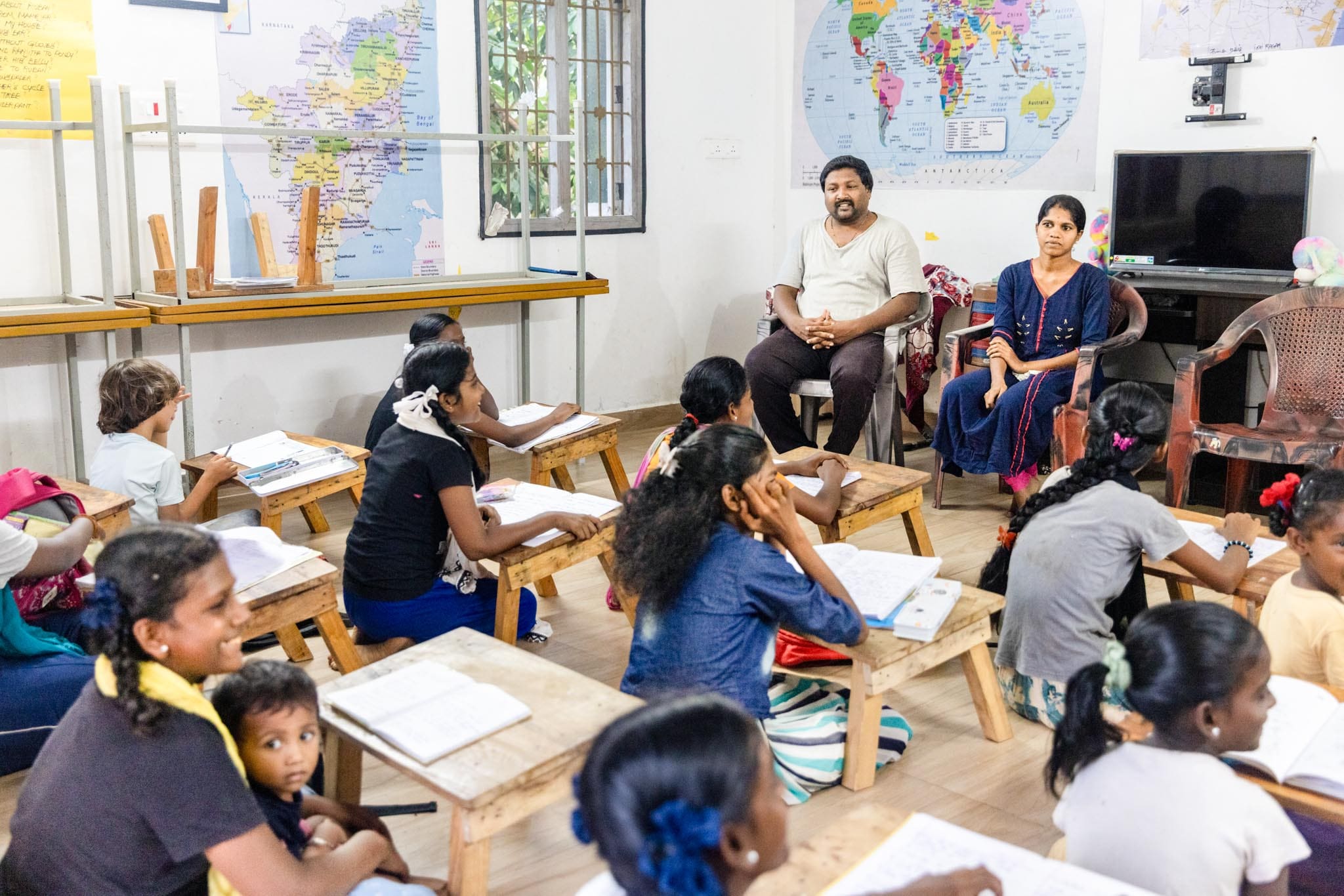 After moving to Auroville, Brigitte first taught music at Isai Ambalam School, a school founded and directed by Ivar, and later transferred to Auroville. Along with Isai Ambalam, Briggite also taught English at other AuroMitra Trust schools, and later worked at the Matrimandir. Seeing many local children missing school, she and Ivar began informal English and math lessons, which gradually evolved into Isai Ragam, formally launched in 2021 under the Auromitra Trust.